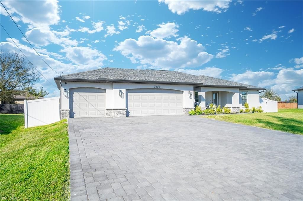 NEW & IMPROVED PRICE! Skip the construction delays and builder-grade finishes with this upgraded 2022 Cape Coral pool home featuring 4 bedrooms, 2 bathrooms, and 1,827 sq ft of living space. Built on the popular St. Augustine floor plan, this home offers vaulted cathedral ceilings and comes with a transferable 10-year structural warranty for added peace of mind. Located in a quiet neighborhood surrounded by newer construction homes.Step outside to your private backyard oasis featuring a heated s...NEW & IMPROVED PRICE! Skip the construction delays and builder-grade finishes with this upgraded 2022 Cape Coral pool home featuring 4 bedrooms, 2 bathrooms, and 1,827 sq ft of living space. Built on the popular St. Augustine floor plan, this home offers vaulted cathedral ceilings and comes with a transferable 10-year structural warranty for added peace of mind. Located in a quiet neighborhood surrounded by newer construction homes.Step outside to your private backyard oasis featuring a heated saltwater pool and spa (2023), fully screened with a sundeck, built-in hot tub, and custom sun shelves with inlaid glass tile accents that perfectly complement the pool design. Ideal for relaxing or entertaining year-round.The 3-car garage is a standout, offering epoxy-coated floors, custom built-in shelving, and a dedicated workshop area. Inside, the open-concept kitchen features granite countertops, a center island, stainless steel appliances, and a separate pantry, while both bathrooms include matching granite finishes. The primary suite offers a dual-sink vanity and walk-in shower, while the guest bathroom includes a full-size tub.Additional upgrades include 18 tile flooring throughout, energy-efficient GT Low-E insulated windows, and a Lennox 15-SEER high-efficiency A/C system. A vinyl privacy fence (2023) enhances the backyard, and the home is equipped with an 8-camera exterior security system with TV integration.Conveniently located near the Burnt Store Boat Ramp, Burnt Store Marina, and Coral Oaks Golf Course, this Southwest Florida home is perfect as a full-time residence, seasonal getaway, or investment property. Move-in ready and packed with value.BUYER INCENTIVE: Preferred lender offering 1% lender credit toward closing costs, subject to buyer qualification and lender approval.